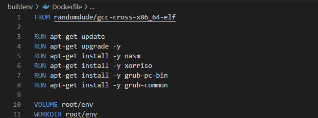 First, we created a docker image, which is like a snapshot of a linux machine with any extra software and files installed onto it. To create the docker image, we created a folder build environment and in there we created a docker file which described all the steps we need to create our build environment image. We based our image on the pre-made image (gcc-cross-x86_64-elf ) which holds all the gcc compilation tools we needed. We installed a few more packages like nasm, to compile our assembly code, also the grub packages (grub-pc-bin and grub-common), for building our final .iso file, also xorriso for the grub packages to work.