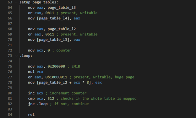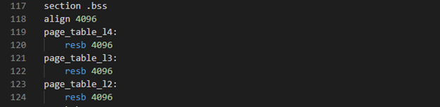 In bss section, we reserve memory for our page tables. Each table is four KB, and we align all the tables to four kilobytes. Then we created our root page table i.e. level four page table of 4096 bytes. We also created a single level three page table and a one level two page table.