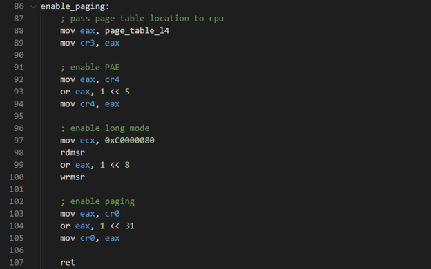 CPU looks for page table location in cr3 register. So, we moved level 4 table address to eax and then copy it to cr3 register. We then enable Physical Address Extension (PAE), by enabling PAE flag in cr4 registers by copying it to eax and then saving it back. We then enable long mode by moving the magic value in ecx register and then running the read model specific register (rmsr) instruction. As a result, a value is loaded in eax register, we then enable the long mode flag which is bit 8 of eax registers content. Finally, we write back to efer register by running the write model specific register (wmsr) instruction.We can enable paging by enabling the bit 31 of the cr0 register.