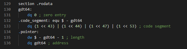 We now enter the 64-bit mode by creating the global descriptor table. We created a read only data section and we begin with 0 entry and create a code segment. In code segment we enabled the executable flag, the descriptor type, the present flag and 64-bit flag. We also created a pointer to the global descriptor table which also holds two bytes of the length of the table.