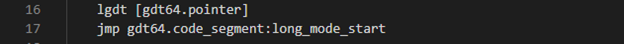 we can now load the global descriptor table, so we need to give it the pointer and then we need to load our code segment into the code selector. Using a jump instruction, we specify our code segment offset and then in the same instruction the cpu jumps to some 64-bit assembly code that we wrote in main64.asm file in a label named long mode start.