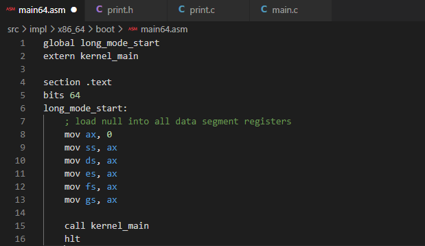 So just like main.asm we created a code segment in main64.am file. The difference is that we set the bits to 64. We also created a global long mode start label and then we loaded 0 into a bunch of data segment registers.