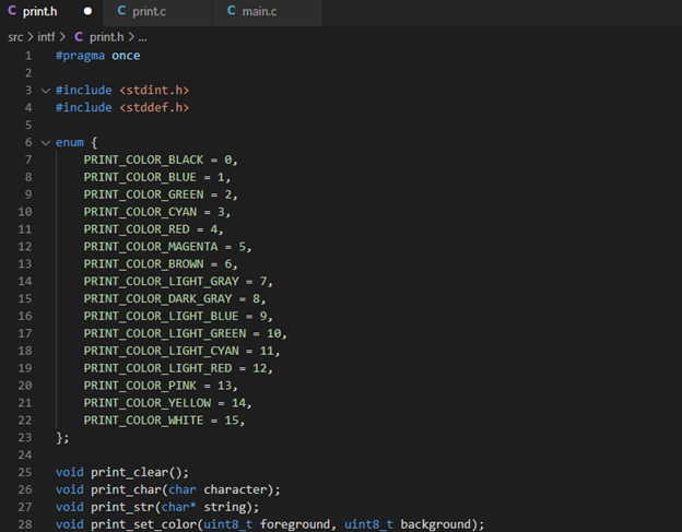 In print.h file, on top we included stdint.h and stddef.h files and then we declared the functions we will be defining in print.c file and finally created enum for colors.