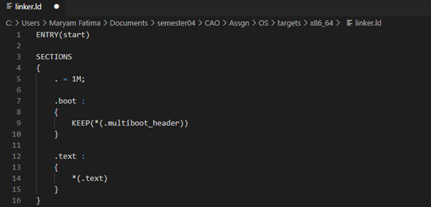 To set up our linker and grub configurations, we created a linker file and a grub configuration file. The linker file describes how we have to link our operating system together. We start by defining the entry point to our system i.e. start as mentioned in main.asm file. Next, we set the current address equal to 1MB and defined the individual sections of our binary like the boot and text sections.