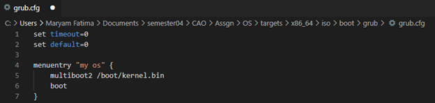 Grub will create an iso file out of our operating system kernel binary. An iso file is a common format for holding an operating system. The grub configuration file defines a menu entry where we specify the name of our OS inside the boot menu. Our binary is multi-boot 2 and we locate this at boot/kernel.bin