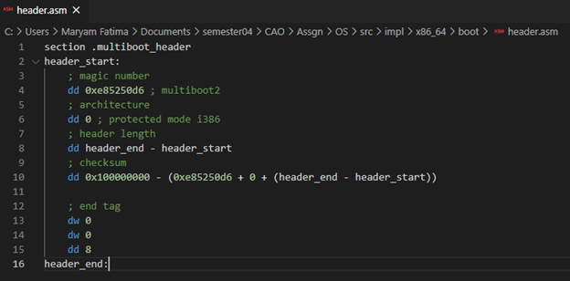 To integrate the entry point to our operating system with multi-boot 2 we created a header.asm file. The magic data in this file is to be included in OS binary so that boot loader (the first thing to start on a computer) understands that we have an OS that can be run on computer.
