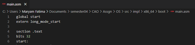 The entry point to our operating system is main.asm file. We created a global start label for our entry point so that we can access it when we are linking.