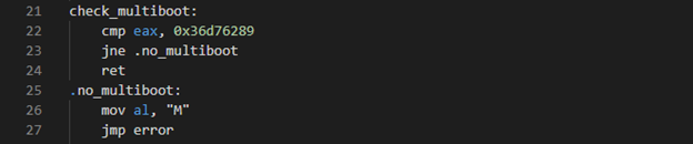 We created the subroutine check multi boot for this purpose. Any bootloader stores the magic value in eax register. If the content of eax is not equal on comparison we jump to no_multiboot label, where we move the letter ‘M’ (multi-boot) and jump to label error to print “ERR: M” on screen and then halt the CPU. Else check for cpu-id.