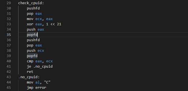 We created the subroutine check cpu id for this purpose. In this sub routine, we attempt to flip the cpu id. If CPU supports cpu id, then id bit of the flags register can be flipped else the attempt of flipping fails. This was achieved by copying eax original content to ecx and then xor-ing the bit 21 of eax which is the id bit. The registers were pushed and again popped from stack then the values of eax and ecx were compared, if they match, we then know that the cpu did not allow us to flip that bit and that cpu id is not available so we jump will to no_cpuid label (where we will move ‘C’ to al register and jump to error code) otherwise we can just return from the subroutine.