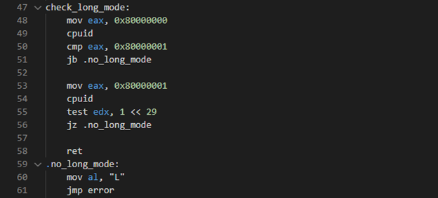 If cpu id supports extended processor info, we will check if CPU supports extended processor info. For thiswe compare eax with 0x80000001. We then run the cpuid instruction again this time cpuid will store a valueinto the edx register and if the lm bit is set then long mode is available. We can test if the ln bit is setwhich is at bit 29. If it is not set, we once again jump to our no long mode label. If it is set, we canreturn successfully from the function. This time the error code is L which stands for long mode and we thenjump to our error instructions.