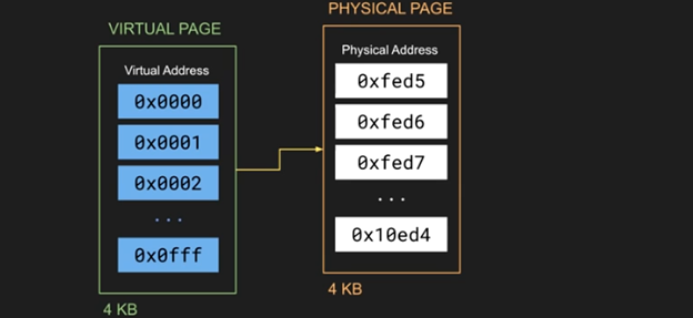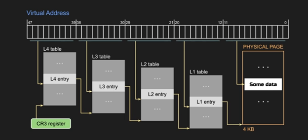 We have 4 types of page tables. Each table can hold 512 entries, so each virtual address takes up 48 bits outof the 64 bits available the other bits are unused. 9 bits are used as an index into each level page table.The final bits of the virtual address are used as an offset in physical page.